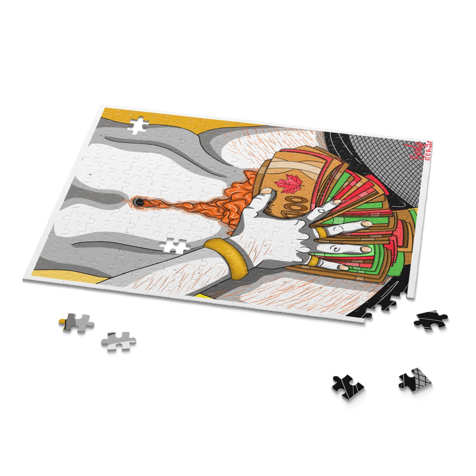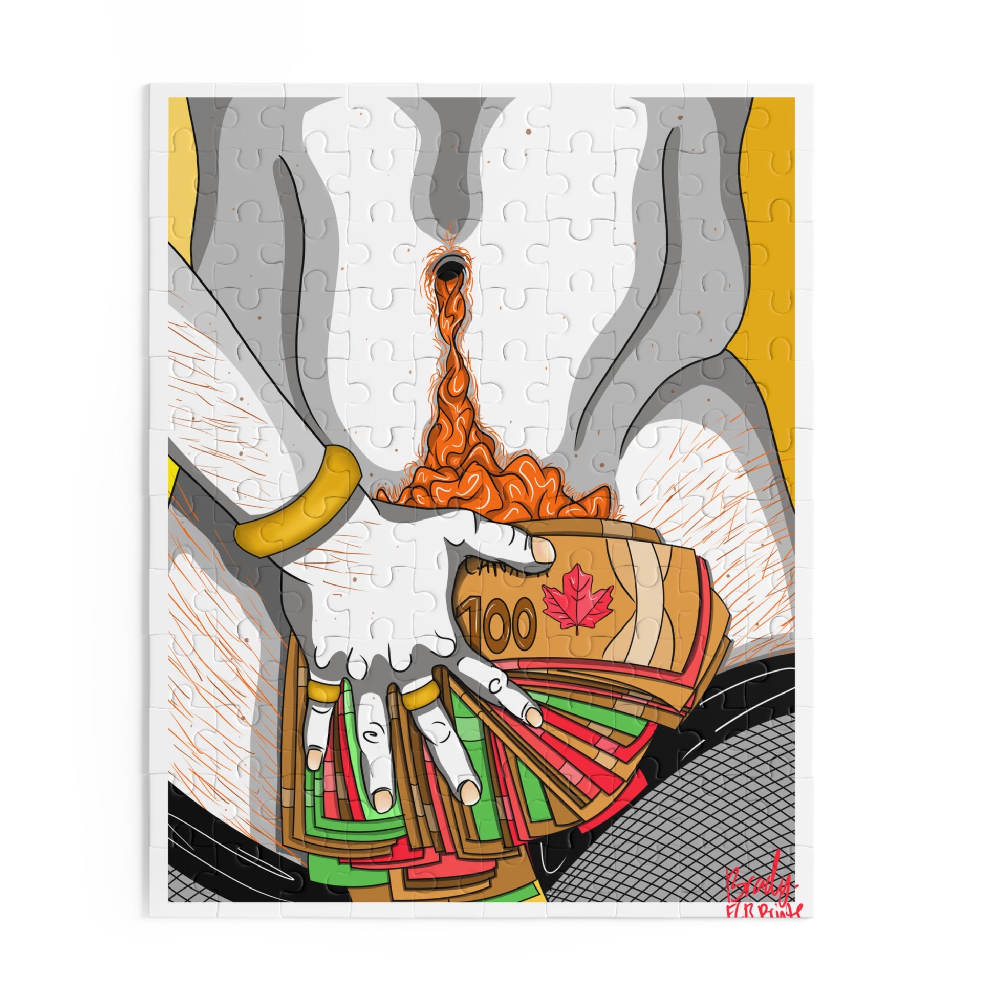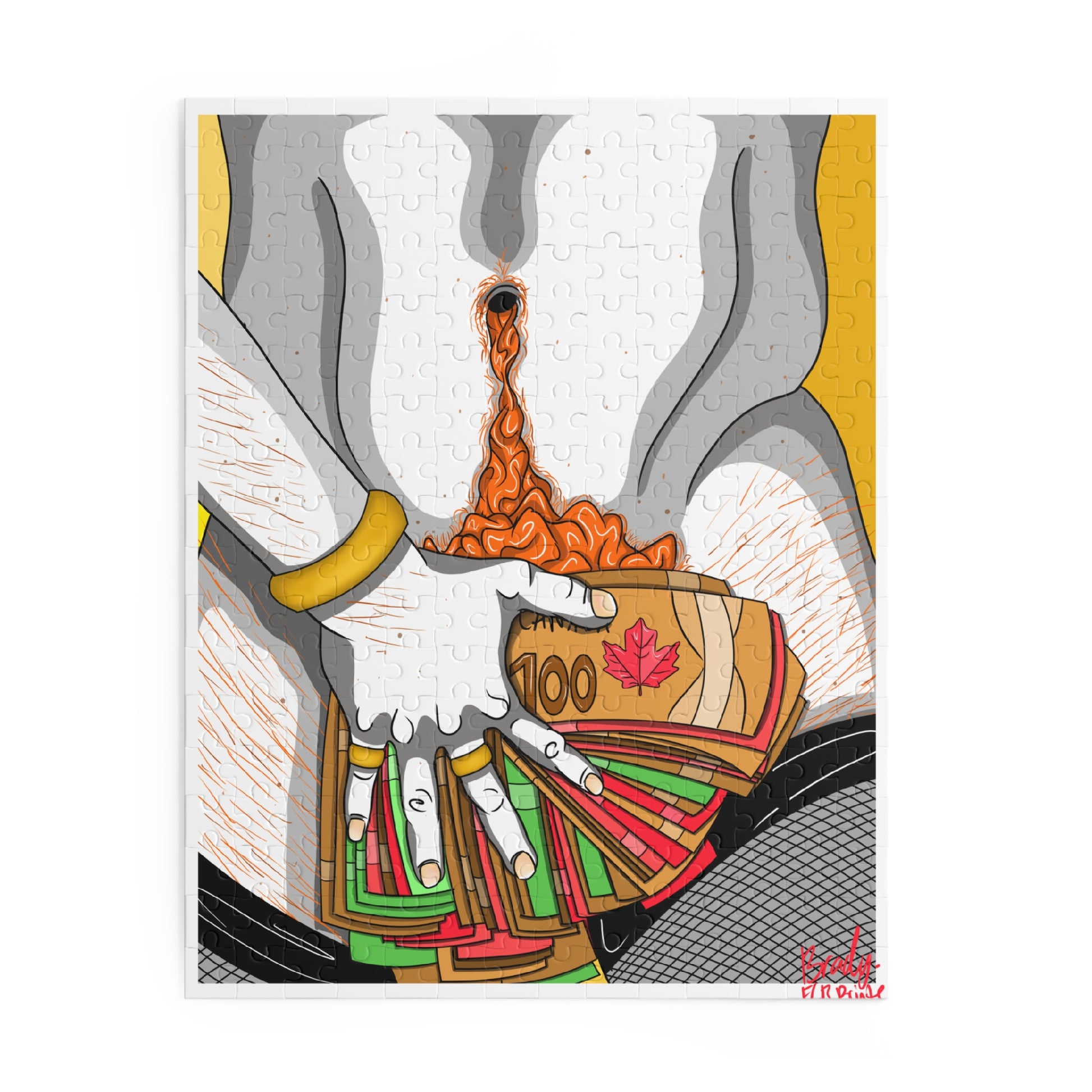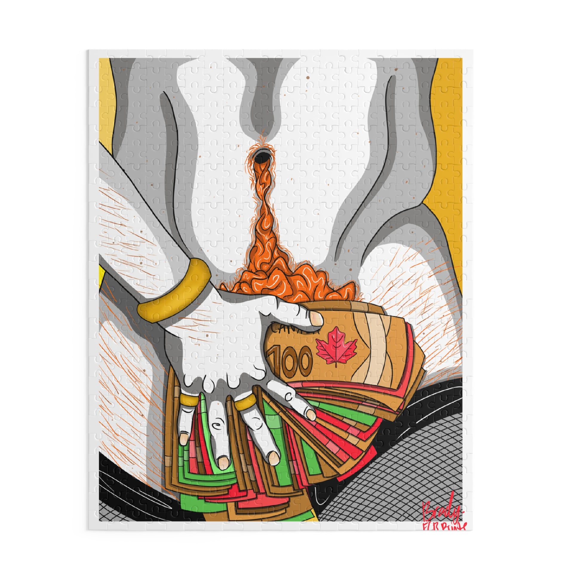 A unique puzzle featuring a design of a man's crotch covered in money, giving off a playful and cheeky vibe. Perfect for puzzle enthusiasts looking for a quirky and entertaining challenge. Ideal for gifting on birthdays, holidays, or as a fun activity for friends and family.