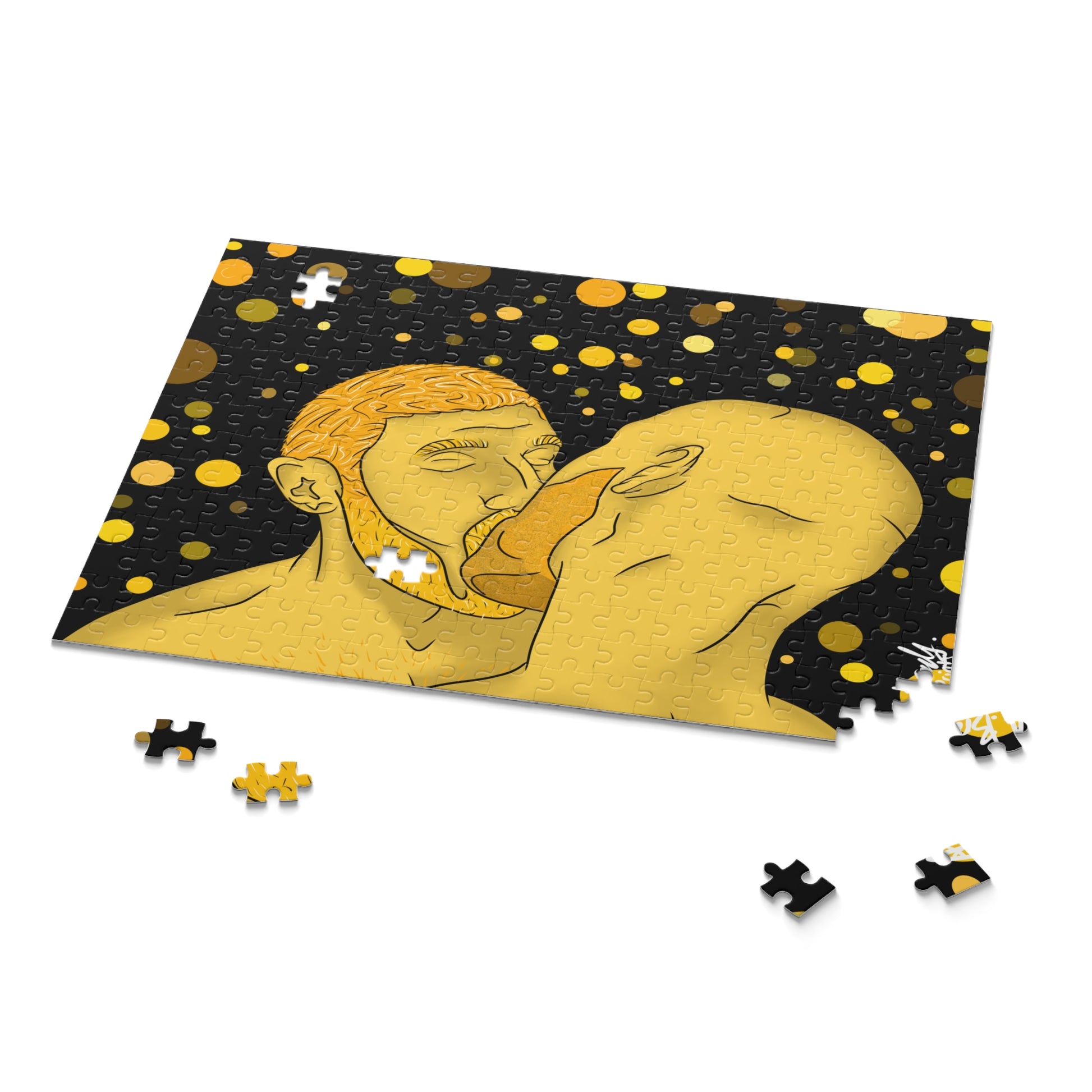 A mesmerizing puzzle featuring a golden kiss on a black background surrounded by golden light and two golden men kissing. Perfect for anyone looking for a unique and artistic challenge. Ideal for puzzle enthusiasts, LGBTQ+ community members, and those celebrating Pride Month.